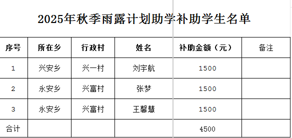 按照《关于组织实施2025年秋季学期雨露计划助学补助工作的通知》(黑农厅函〔2025〕2710号)要求,我县开展2025年秋季雨露计划助学补助工作,为脱贫家庭学生3人,每人发放补助金1500元,共计4500元,发放明细附后。现予以公示,接受广大群众和社会各界监督。