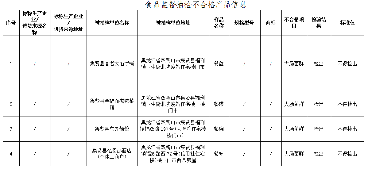 一、集贤县高老太馅饼铺(抽样日期:2025年12月6日)使用的餐盘,大肠菌群检测值不符合食品安全国家标准规定。